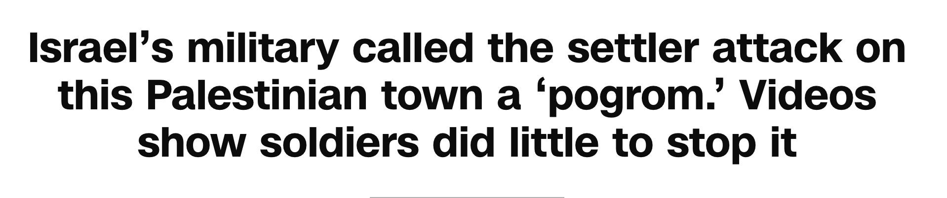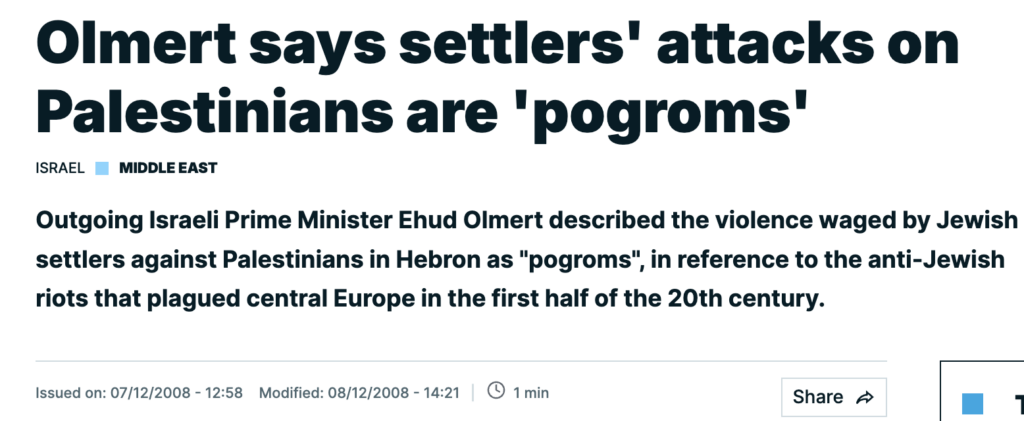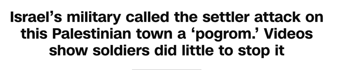 The brief Israeli coverage of Huware consisted of Israeli reassuring themselves that this is “not who we are” while then carrying on with their lives, totally unconcerned that settler violence has not abated. It was not unprecedented. This cycle repeats itself over and over. In fact, an Israeli prime minister, while in office, has referred to settler terrorism as a pogrom, just as the IDF chief did in reference to Huwara. But nothing ever changes.