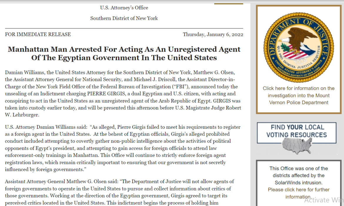 Egyptian-American citizen Pierre Girgis was arrested by the FBI earlier this month for spying on other Egyptian Americans in the United States for the government of Egypt. Girgis was indicted and charged by the US Department of Justice for acting as an unregistered agent of the Egyptian government in the United States.